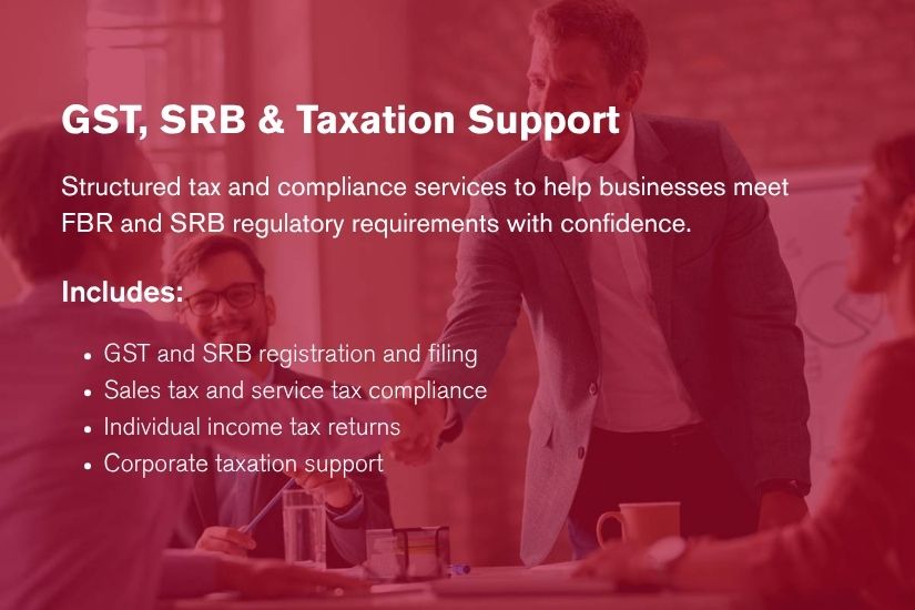 Processes aligned with FBR and SRB regulations to ensure smooth tax and compliance management.